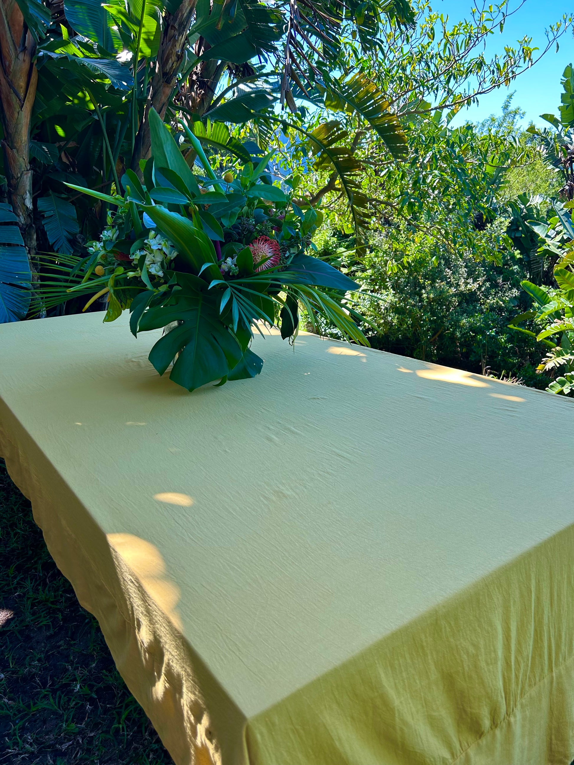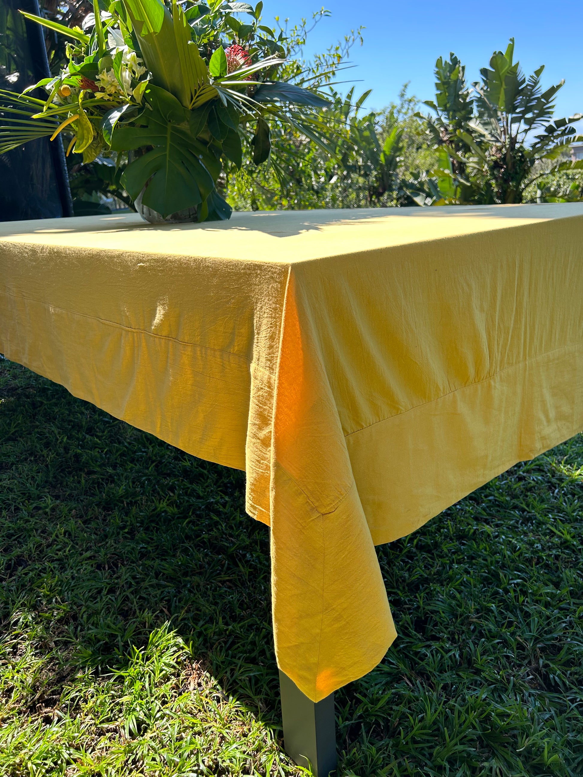 Mimosa coloured tablecloth with mitered corner